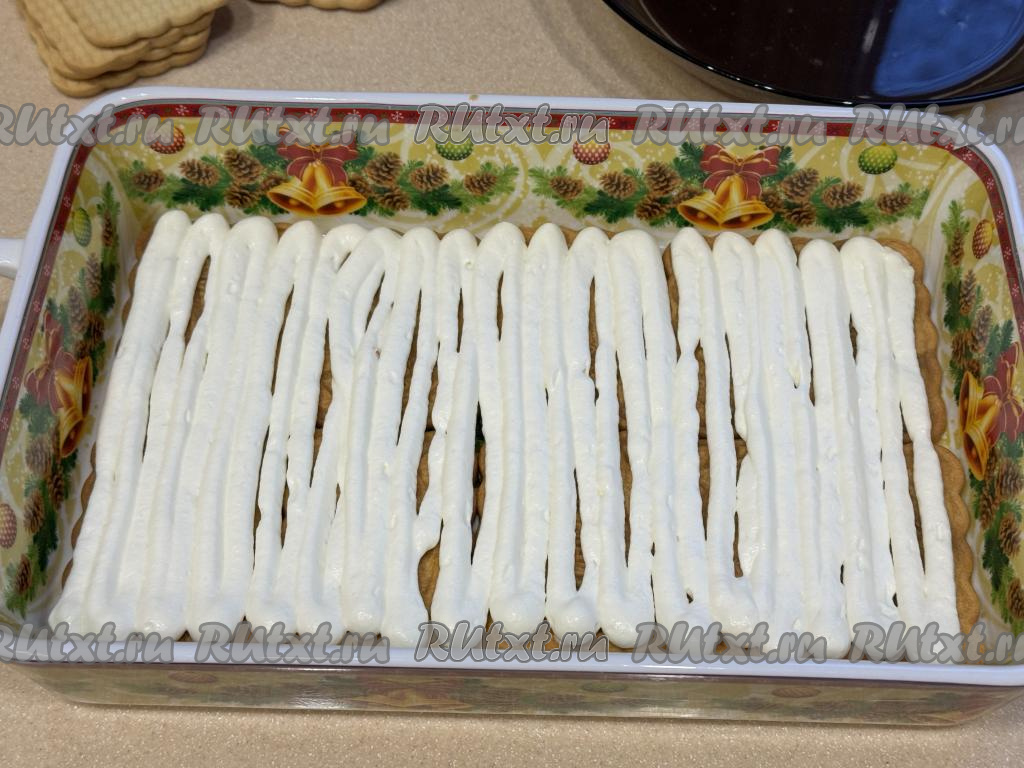 Отсадить ровным слоем часть крема поверх печенья. Если у вас нет кулинарного мешка, можно выкладывать и равномерно распределять крем столовой ложкой.