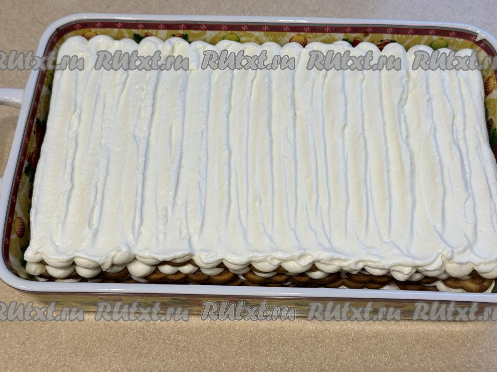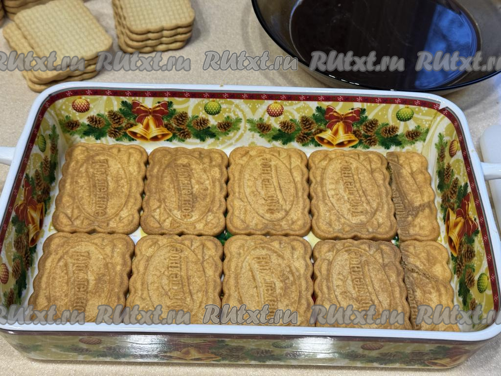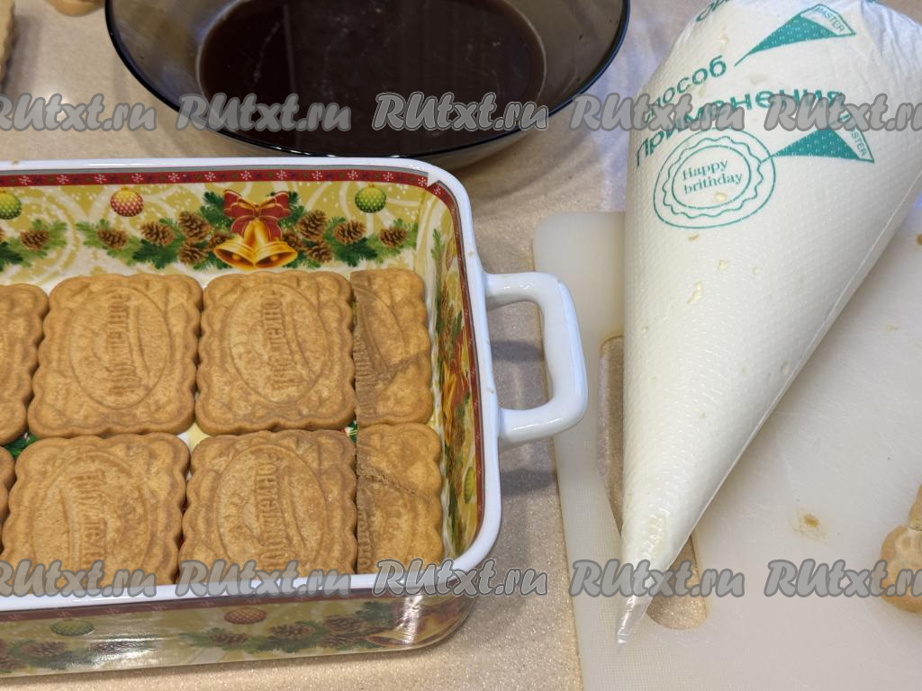 Печенье "Юбилейное", пропитанное кофе, сразу выкладывать первым слоем в подходящую квадратную или прямоугольную форму, в которой вы будете формировать тирамису. Я формировала в прямоугольной форме размером 27 сантиметров на 17 сантиметров.