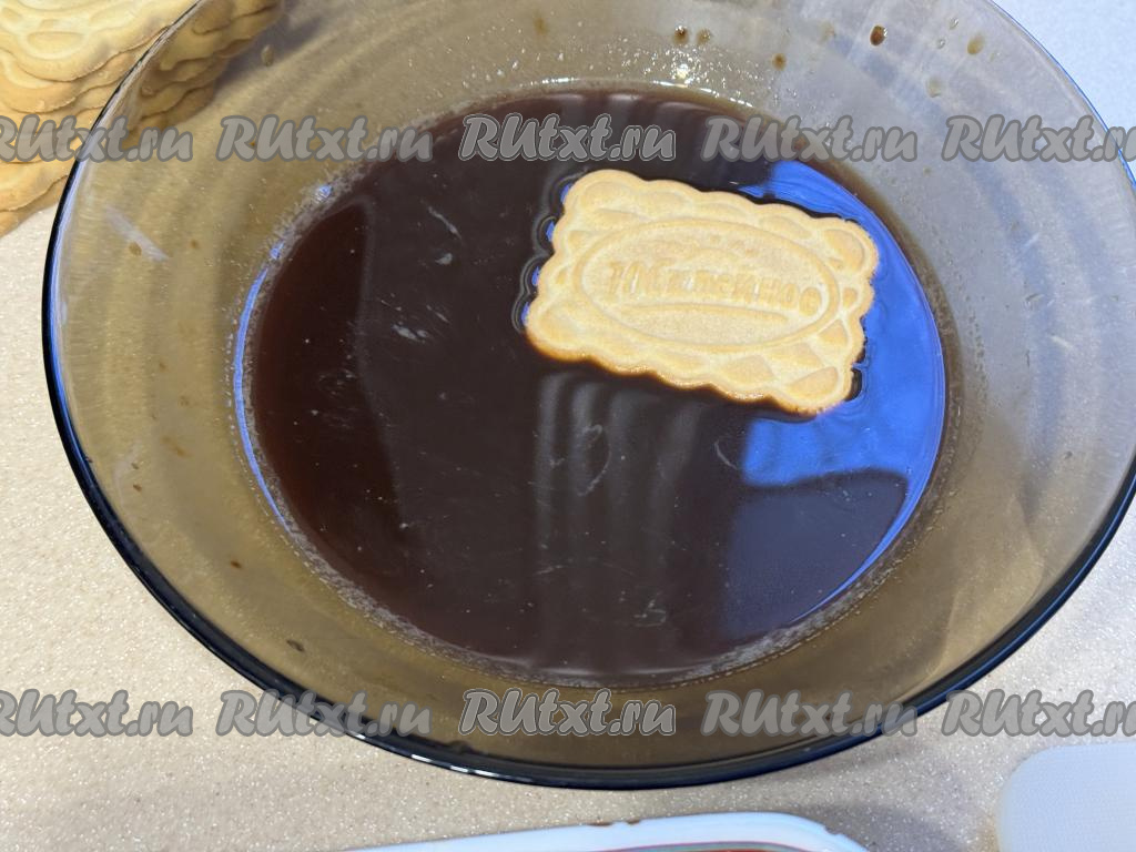 Остывший кофе влить в достаточно глубокую тарелку. Каждое печенье полностью окунать в кофе.