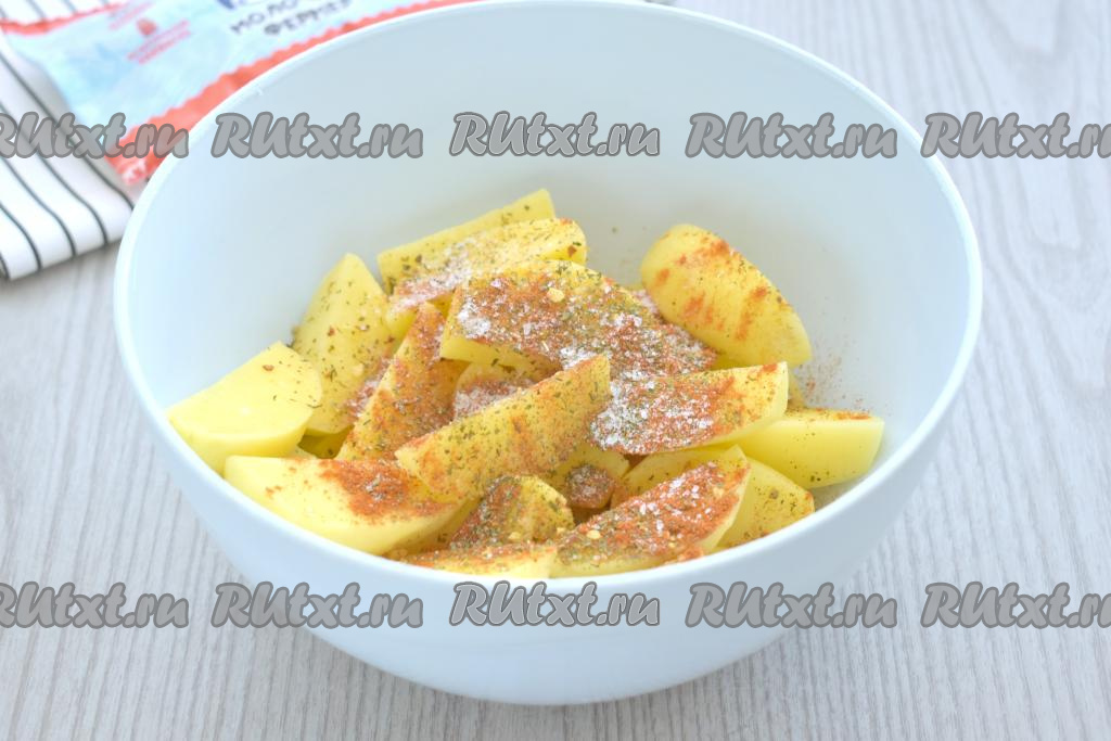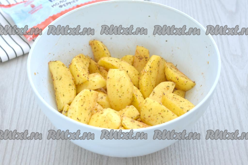Тщательно перемешиваем дольки картофеля, покрывая их специями со всех сторон.