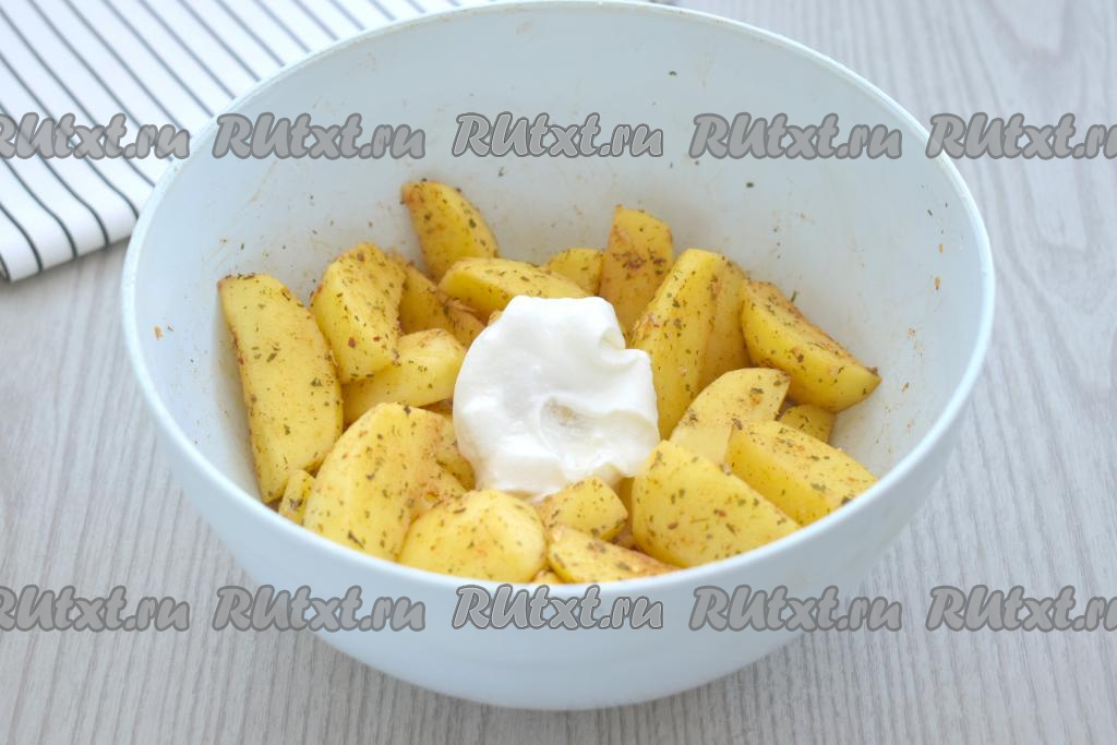 К картошке, смешанной со специями, добавляем сметану и растительное масло.