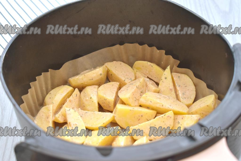 Застилаем чашу аэрогриля пергаментом, затем выкладываем картошку, покрытую сметаной и специями. Отправляем чашу с картофелем в аэрогриль. Включаем аэрогриль на 180 градусов, устанавливаем время - 35 минут.