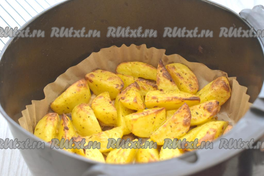 Через 20 минут с момента начала запекания достаём чашу из аэрогриля, картофель перемешиваем, снова отправляем в аэрогриль и запекаем оставшиеся 15 минут (до готовности картофеля). Для того чтобы проверить готовность, нужно проткнуть дольку картошки зубочисткой, если зубочистка входит легко, значит картофель готов. Продолжительность запекания во многом зависит от мощности аэрогриля, сорта картошки и величины нарезки картошин. Если картошка по прошествии 35 минут с момента начала запекания будет не готова, перемешайте картофель и продолжайте запекать в аэрогриле ещё 5-10 минут.  Я готовила в аэрогриле мощностью 1400 Ватт, картофель по прошествии 35 минут был полностью готов.