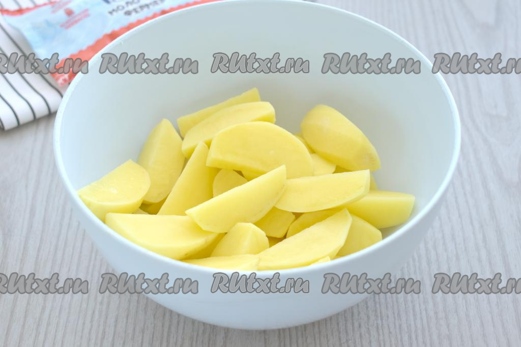 Нарезаем картофель на небольшие дольки, перекладываем их в миску.