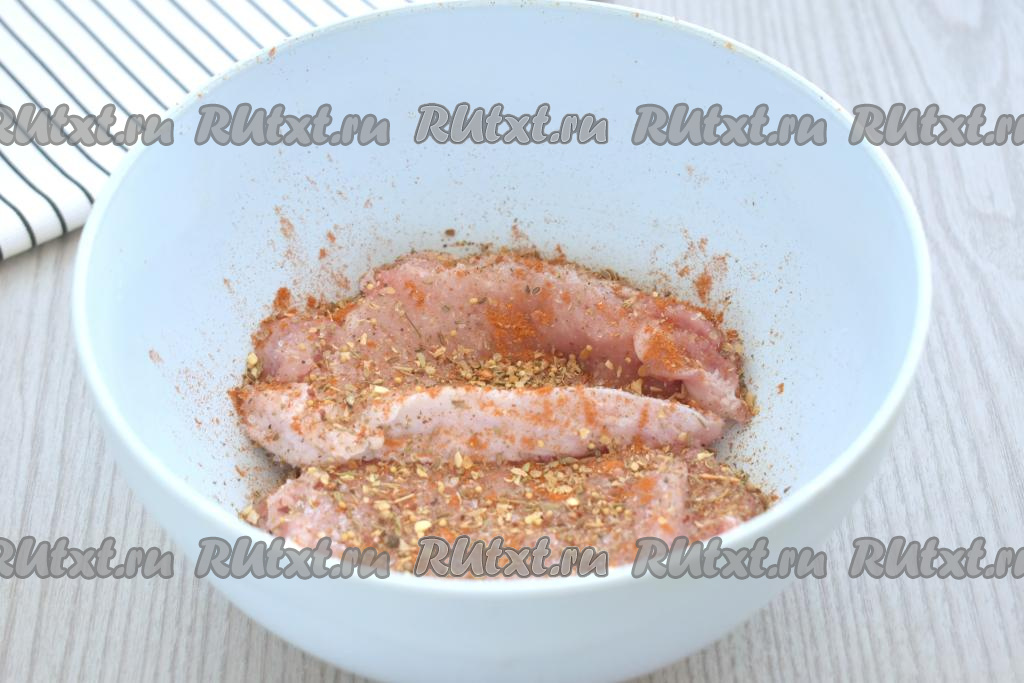 Стейки из карбоната свинины перекладываем в миску. Натираем мясо со всех сторон специями (в качестве специй я добавила 1 чайную ложку приправы для свинины и паприку). Немного солим свинину со всех сторон (добавляя соль, обязательно учитывайте, что соевый соус достаточно солёный).