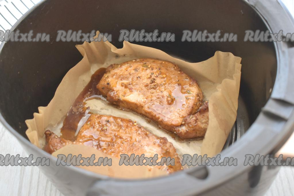 Чашу аэрогриля застилаем пергаментом, затем выкладываем стейки из карбоната свинины, замаринованные в соевом соусе. Чашу с мясом отправляем в аэрогриль. Включаем аэрогриль на 180 градусов, время устанавливаем - 30 минут.
