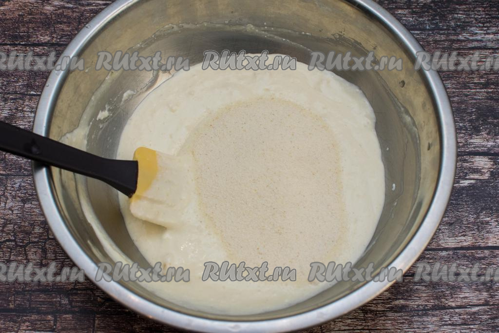 В миску с творожно-банановой массой всыпать манку, хорошо перемешать и дать тесту постоять при комнатной температуре в течение минут 10-15 минут, чтобы манка успела набухнуть. Сначала будет казаться, что тесто жидкое, но через 10-15 минут манка набухнет и тесто по консистенции будет напоминать в меру густую сметану.