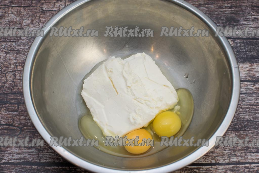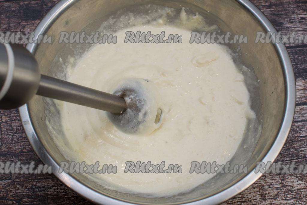 Погружным блендером пробить творог, яйца, банан и сахар до получения однородной творожно-банановой массы.