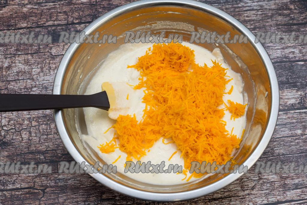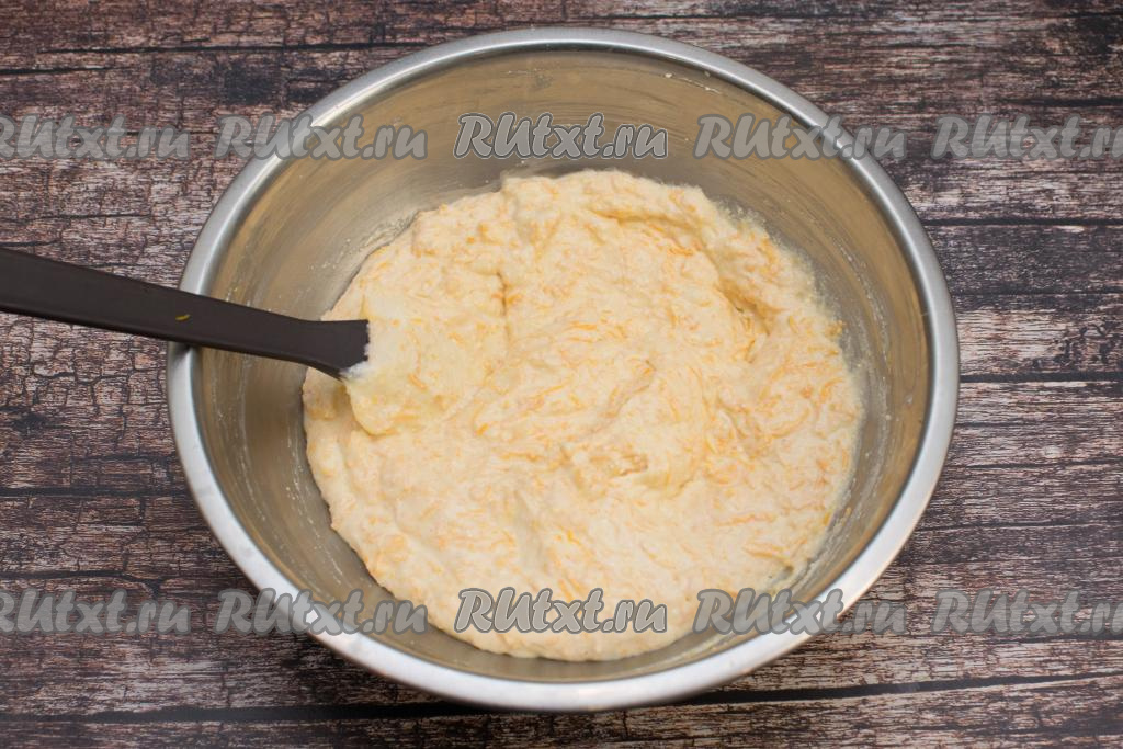 Пока манка набухает, нужно тыкву очистить от кожуры и волокон с семечками. Для запеканки нам потребуется 150 грамм очищенной тыквы. Натереть очищенную тыкву на мелкой тёрке. После того как манка набухнет в течение 10-15 минут добавить в тесто натёртую тыквы.