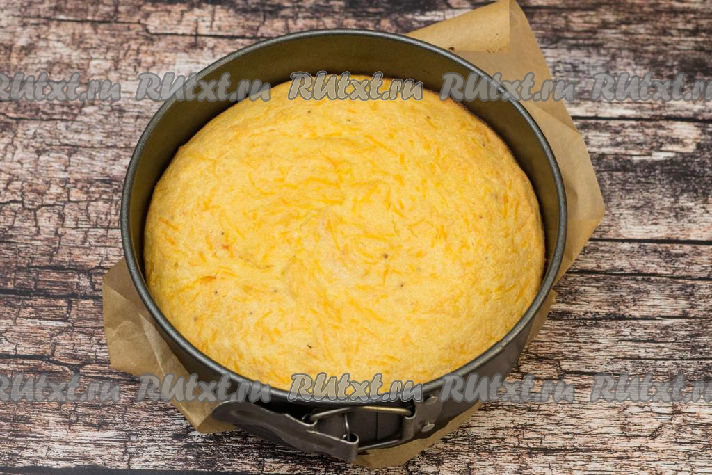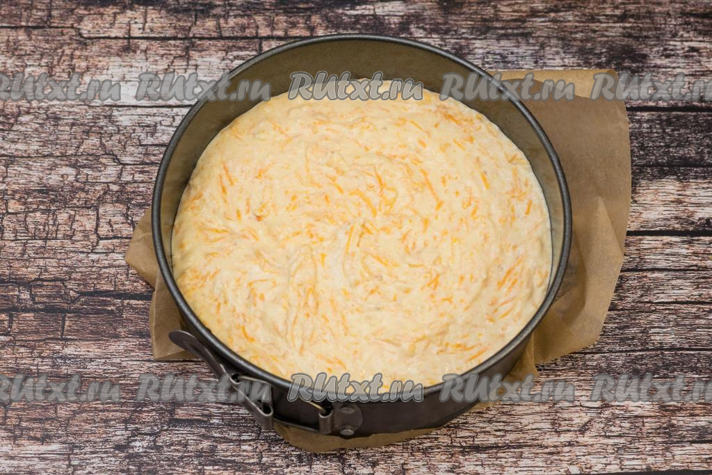 Дно формы для выпечки диаметром 18 сантиметров застелить пергаментом. Бока формы и дно, застеленное пергаментом, смазать растительным маслом, чтобы запеканка не пристала к форме во время выпечки.