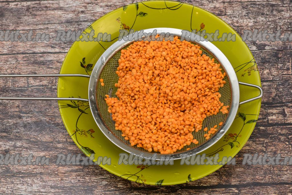 Налить в кастрюлю 2,5 литра воды, поставить на сильный огонь, довести до кипения. Пока закипает вода, чечевицу выложить в сито, тщательно промыть под проточной водой, лишней воде дать стечь.