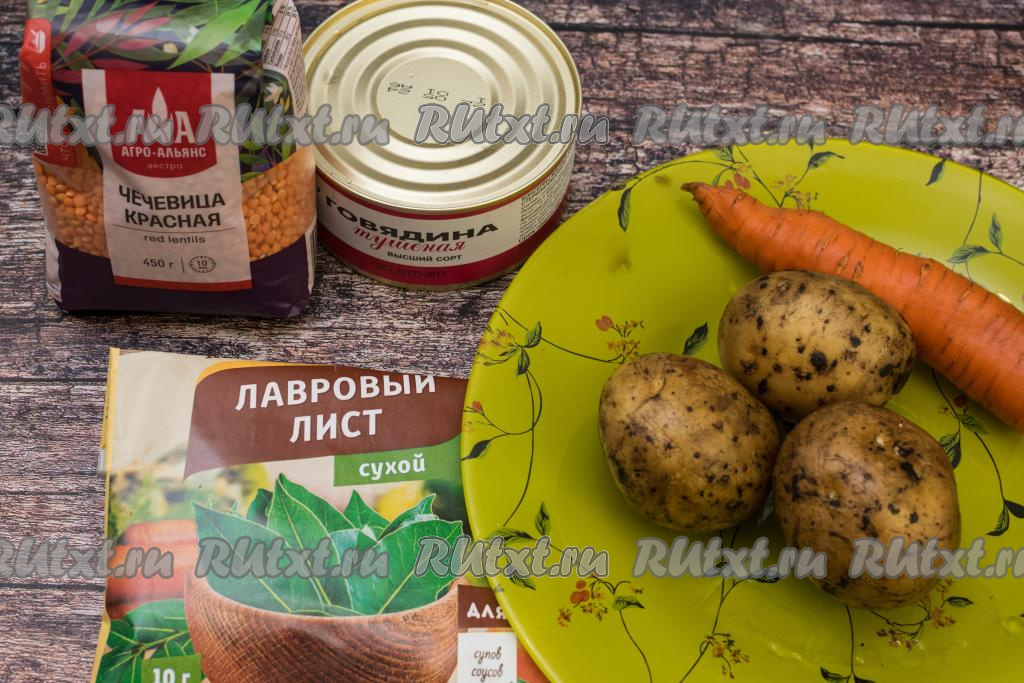 Для приготовления супа с чечевицей и тушёнкой потребуется: