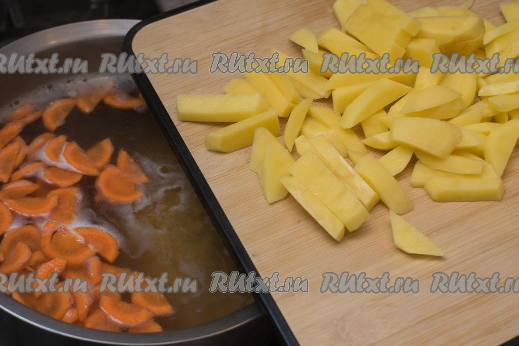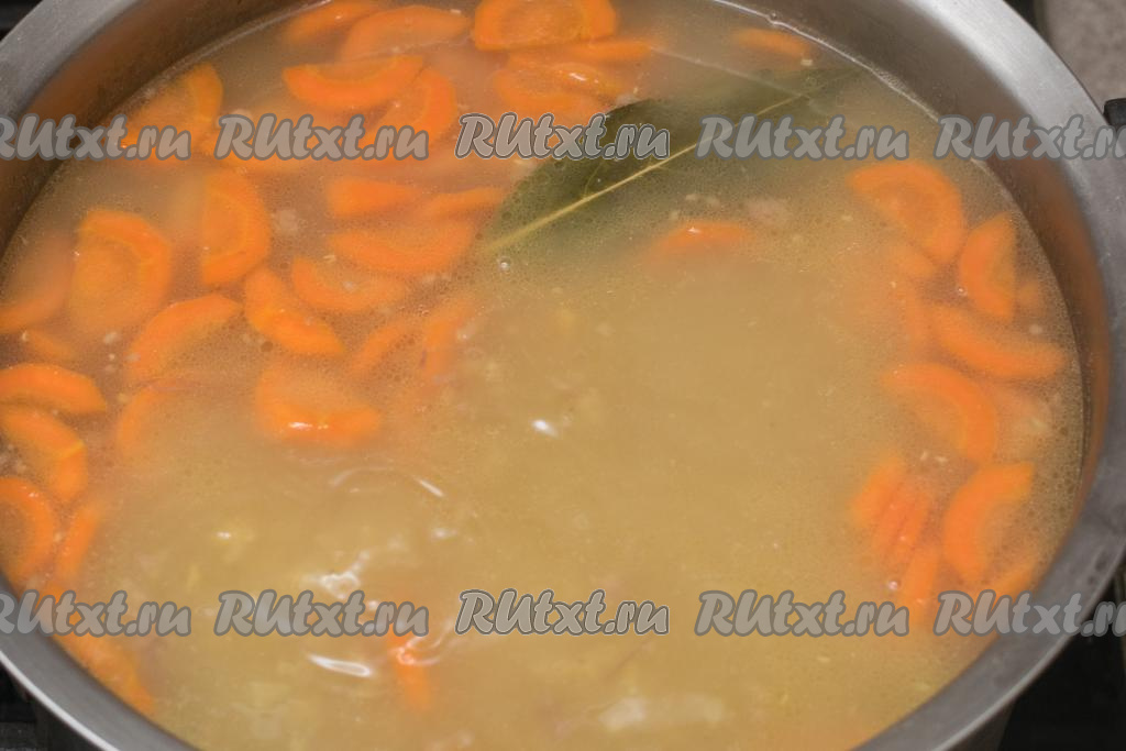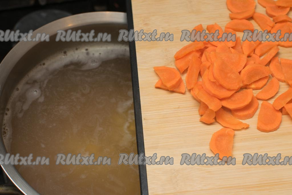 После того как чечевица станет мягкой, добавить в кастрюлю очищенную морковку, нарезанную на достаточно тонкие полукружочки (или брусочки).