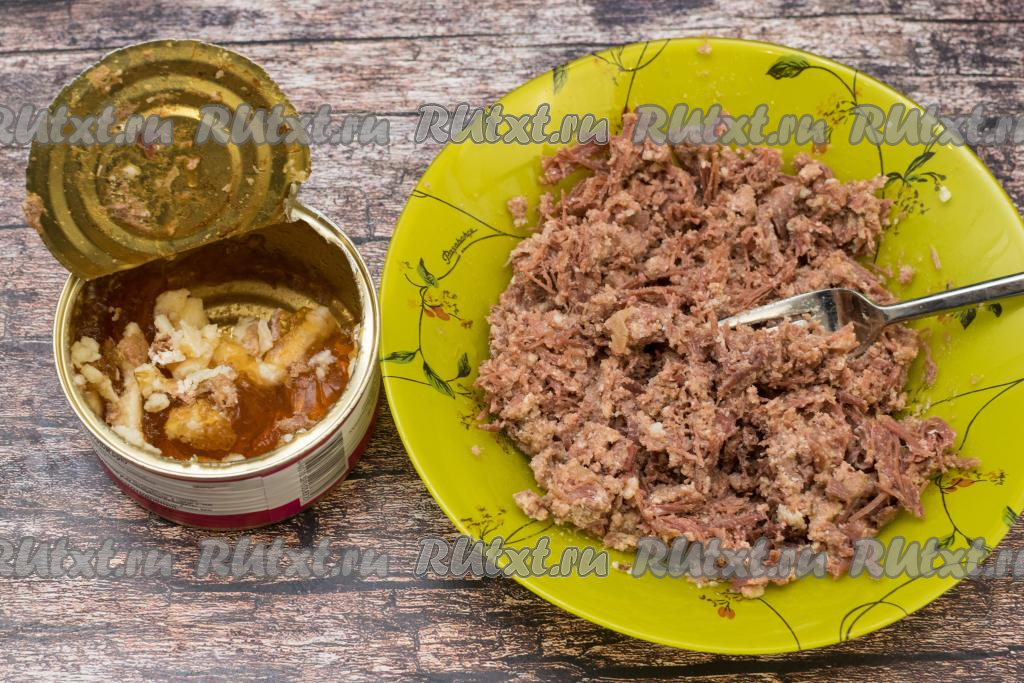 Открыть банку тушёнки. Выложить на тарелку тушёнку без жира, размять кусочки мяса вилкой.