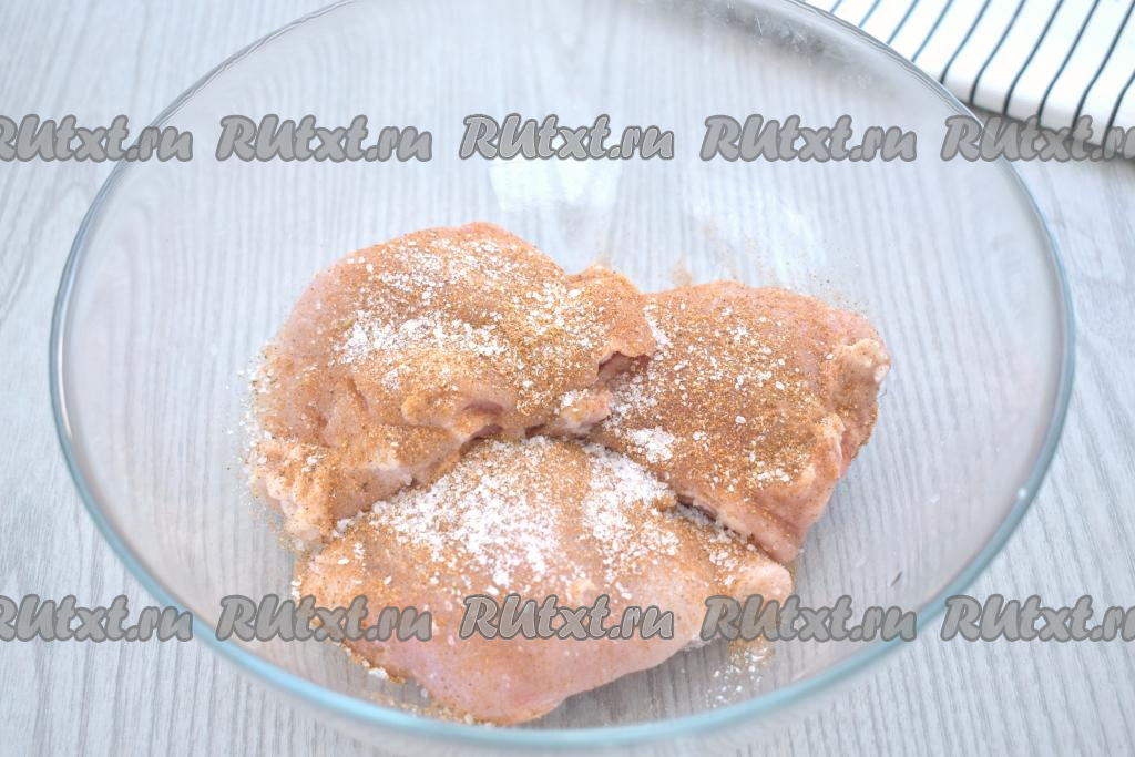 С куриных бёдер, по желанию, снимаем кожу. Бёдра моем, обсушиваем, затем выкладываем их в глубокую миску. Натираем бёдрышки солью и специями со всех сторон (в качестве специй я использовала 1 чайную ложку приправы для курицы). Оставляем мясо "отдохнуть" на 10 минут, чтобы бёдрышки пропиталось специями.