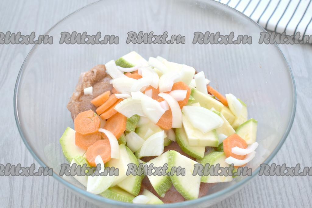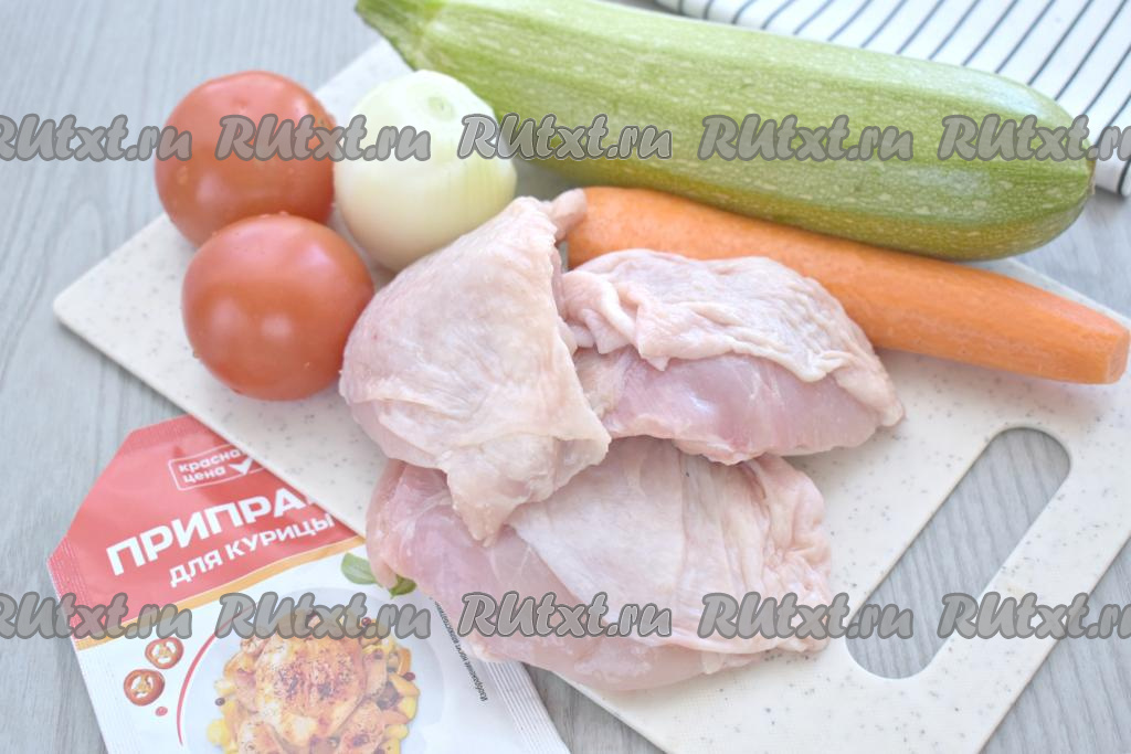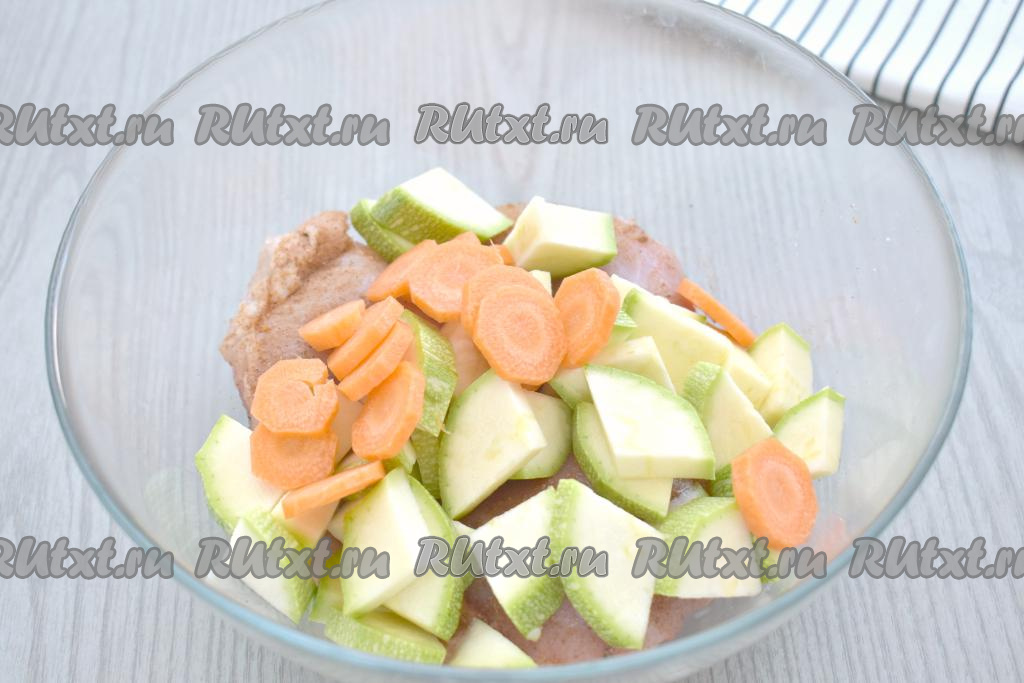 Кабачок нарезаем на кусочки толщиной 5 миллиметров, морковь нарезаем на тонкие кружочки, добавляем в миску с бёдрами.