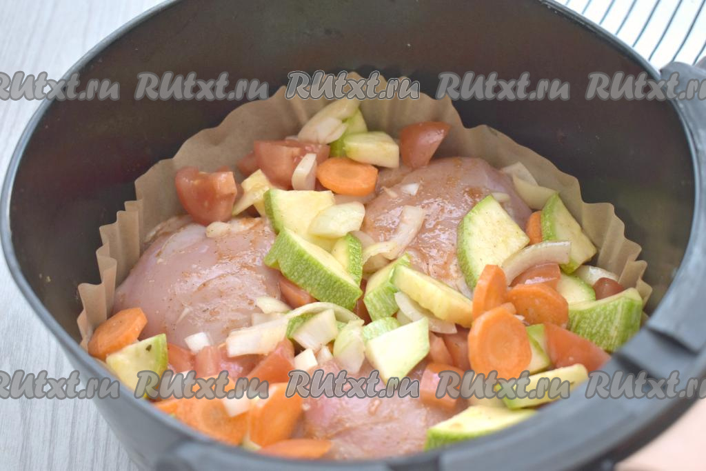 Чашу аэрогриля застилаем пергаментом, выкладываем куриные бёдра с овощами. Отправляем чашу в аэрогриль. Включаем аэрогриль, выставив температуру на 200 градусов, а время - на 40 минут.