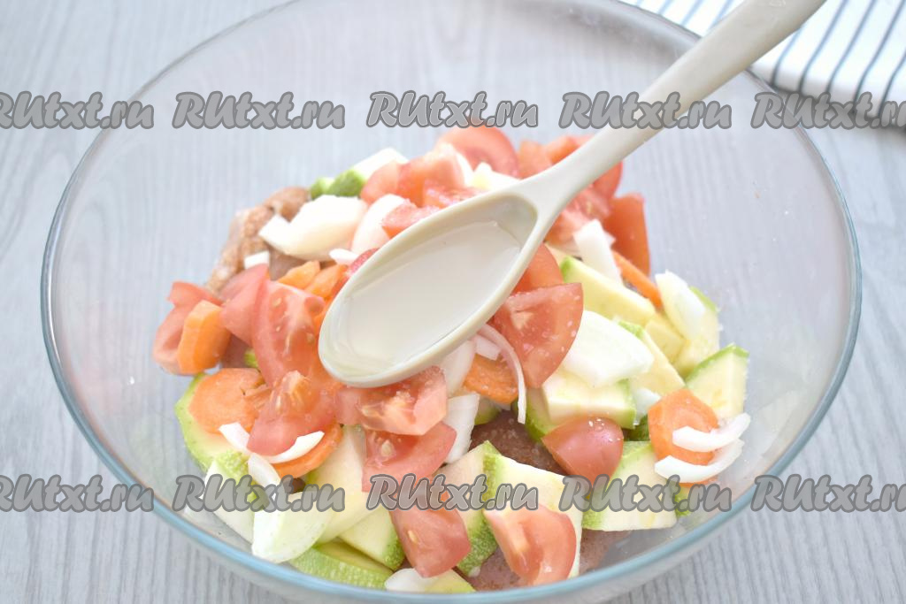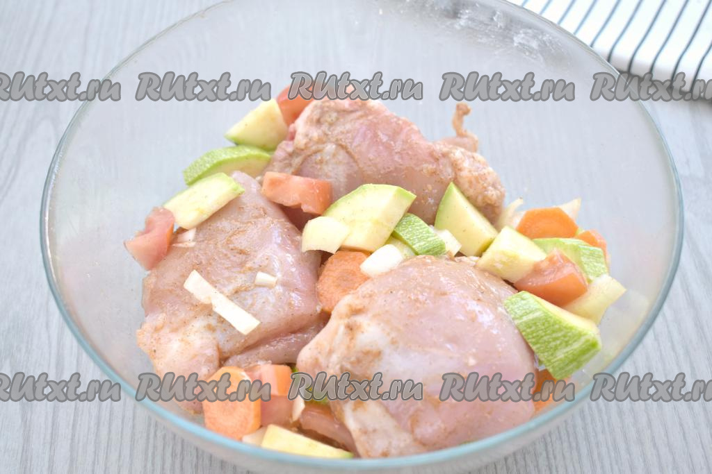 В миску с куриными бёдрами и овощами выкладываем помидоры, нарезанные на части (по желанию, предварительно с помидоров можно снять кожуру), вливаем растительное масло. Солим овощи по вкусу, перемешиваем.
