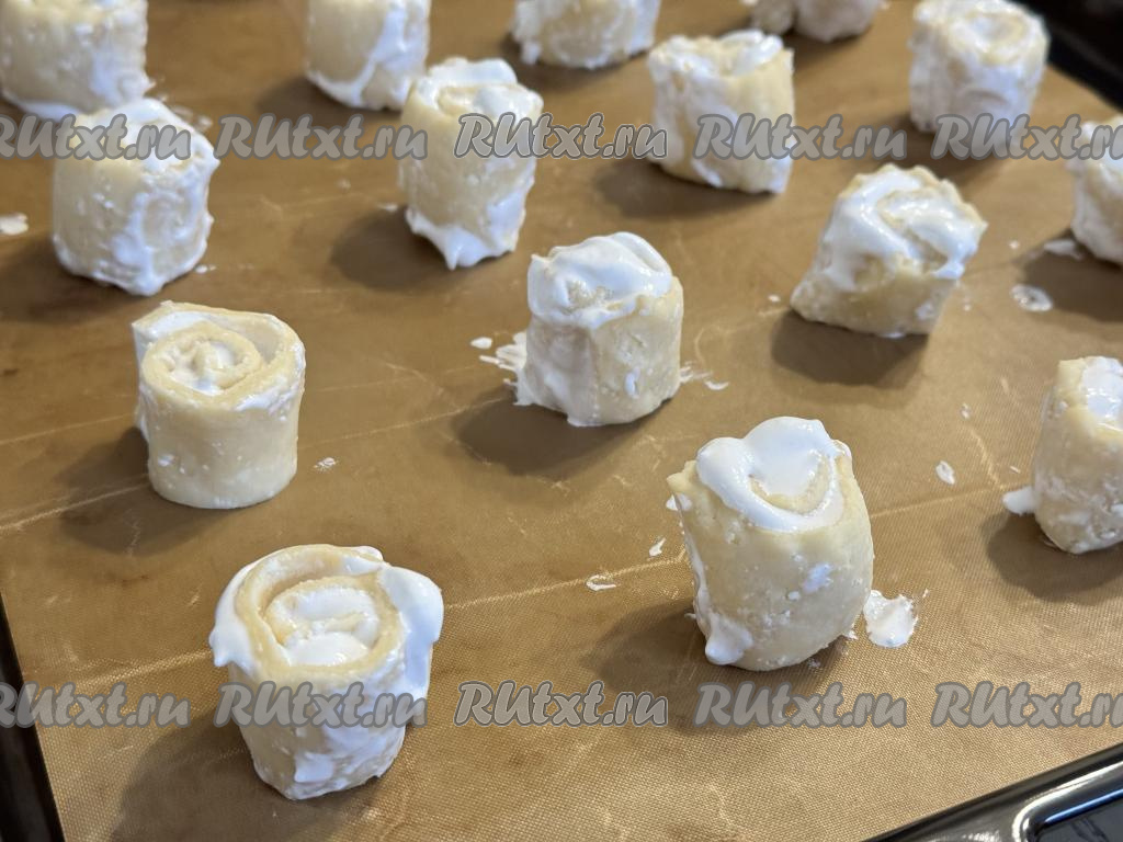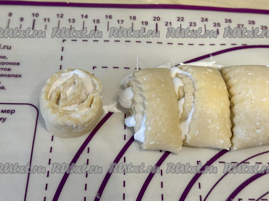 Творожное тесто, покрытое взбитыми белками, свернуть в рулет, начиная с более длинной стороны пласта. Нарезать получившийся рулет на кусочки толщиной примерно 2,5 сантиметра.