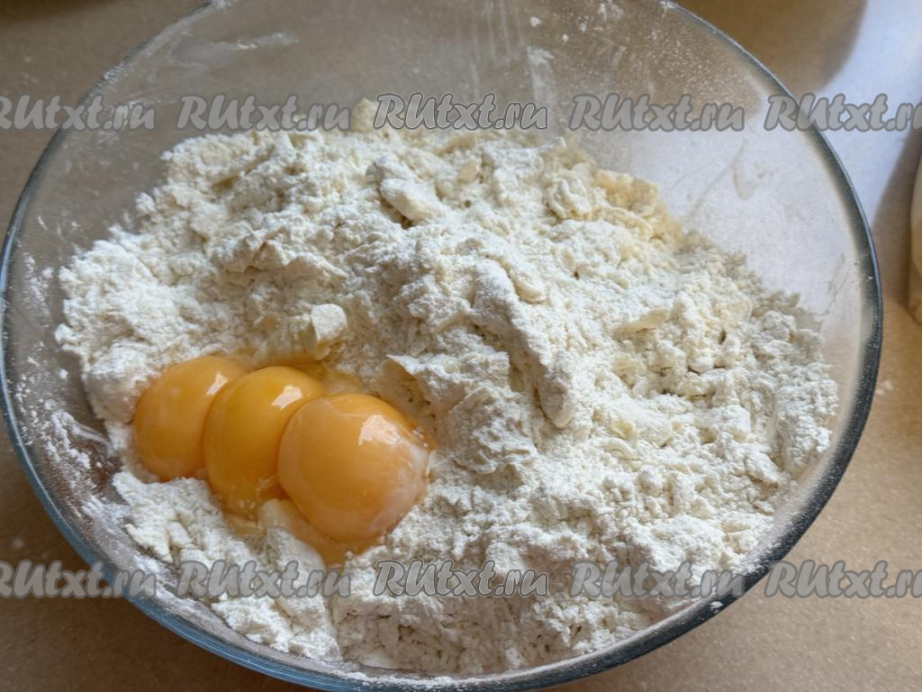 Яйца аккуратно разделить на белки и желтки. В белки не должна попасть ни капля желтков, иначе белки в дальнейшем могут не взбиться. Ёмкость с белками пока убрать в холодильник (в дальнейшем из белков будем готовить безе). Желтки выложить в миску с крошкой из муки и масла.