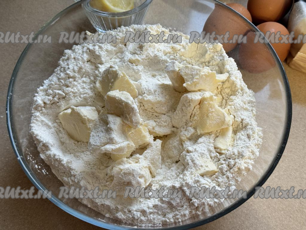 Прежде всего замесим творожное тесто для печенья. Для этого из холодильника нужно достать сливочное масло, нарезать его на кусочки. В глубокую миску всыпать 350 грамм просеянной муки, ванильный сахар, добавить кусочки холодного масла, размять руками до получения крошки.