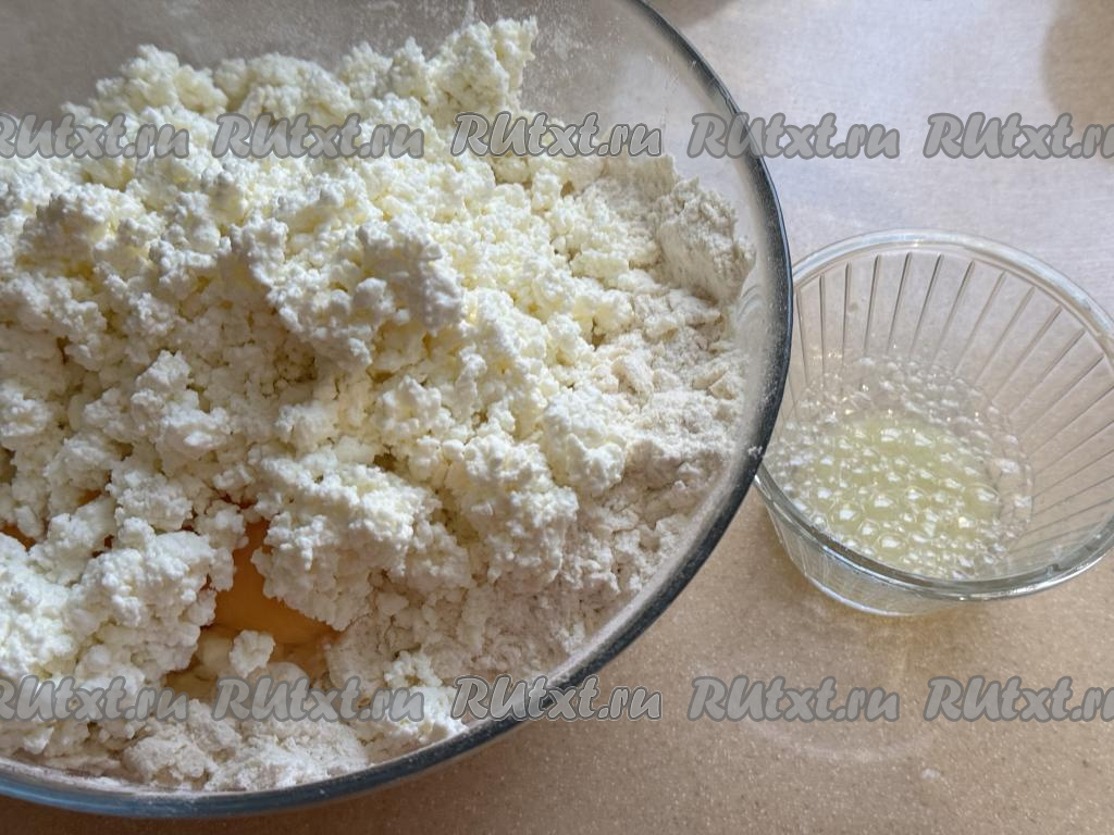 Вначале перемешивать творожное тесто вилкой (или столовой ложкой), а затем продолжить замешивать творожное тесто руками, подсыпая по мере необходимости оставшуюся муку. Добавляя понемногу муку и вмешивая её, учитывайте, что творожное тесто должно собраться в пластичный, мягкий, не липнущий к рукам шар. Влажность творога, размер яиц могут быть разными, а значит муки для замешивания теста может потребоваться чуть больше или чуть меньше, чем указано в ингредиентах, главное - ориентироваться на структуру замешиваемого творожного теста. Как только добились нужной консистенции теста, значит не нужно больше добавлять муку. Замешанное творожное тесто поместить в целлофановый пакет и убрать в холодильник на 1 час.