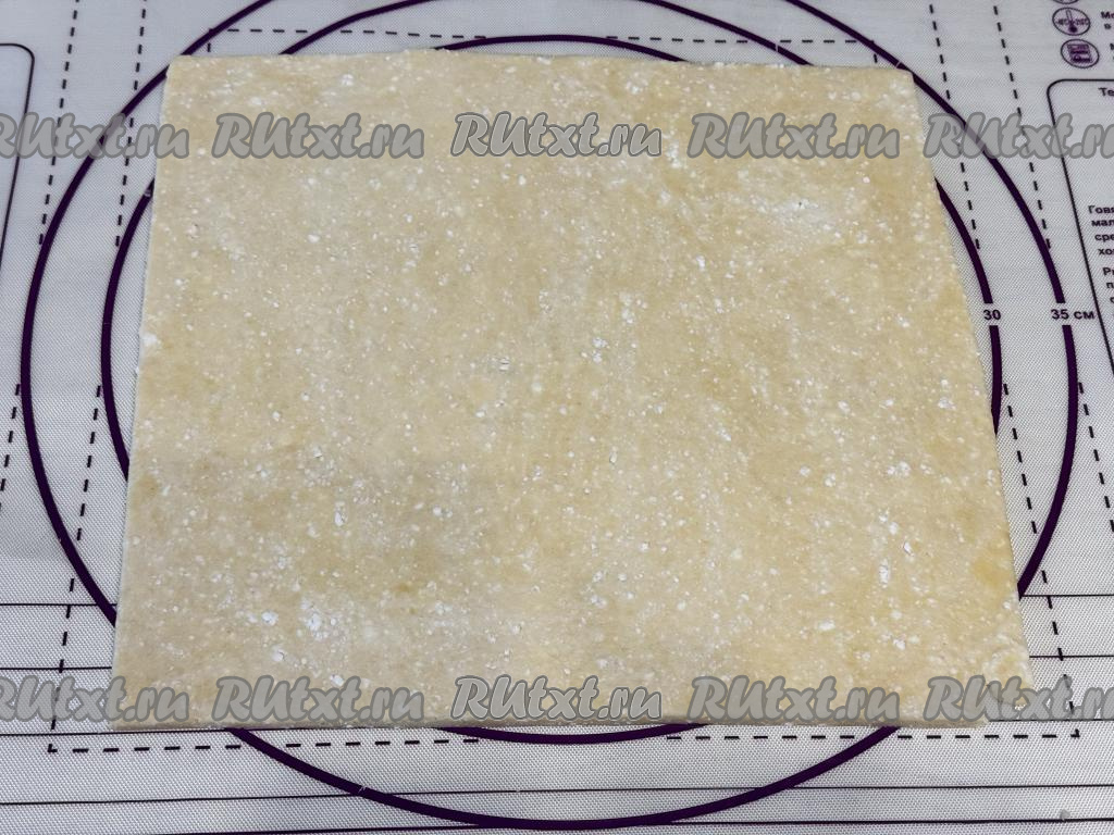 На присыпанной мукой поверхности раскатать вначале одну часть творожного теста в пласт толщиной 3-4 миллиметра.