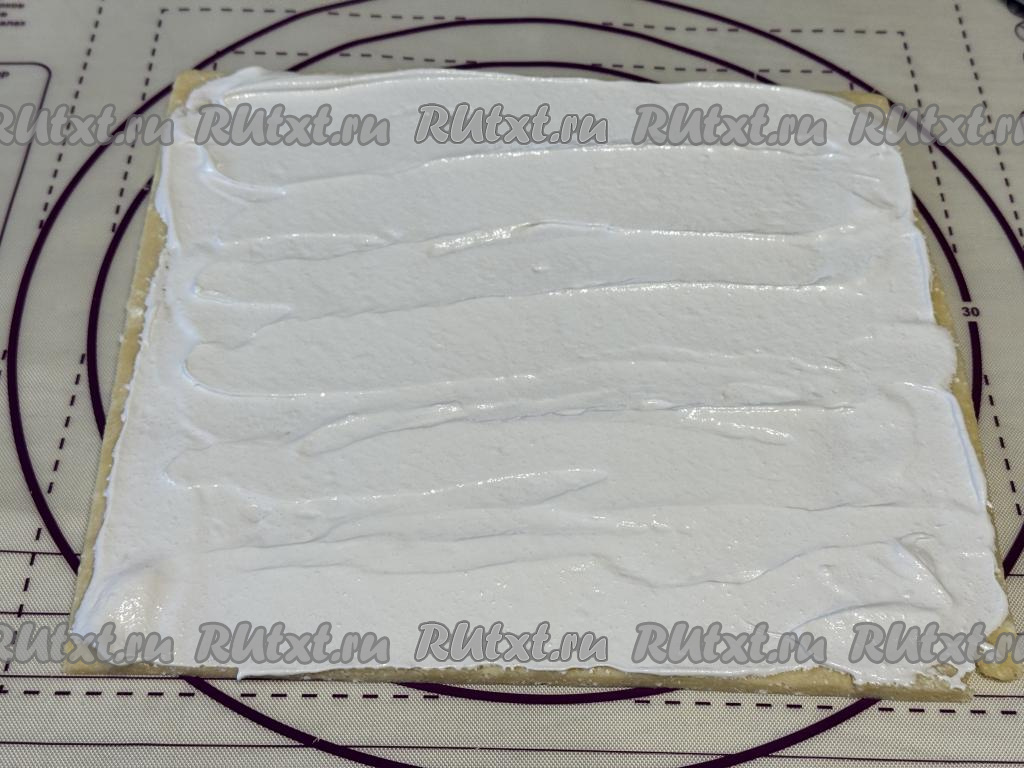 Смазать пласт теста 1/4 частью взбитых белков. С помощью лопатки разровнять белки по тесту.