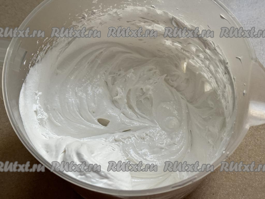 После того как творожное тесто охладится, можно заняться подготовкой безе. Для этого достать яичные белки, которые мы ставили в холодильник, вылить их в абсолютно сухую чашу миксера, добавить сахар. Начать взбивать белки на небольшой скорости миксера, постепенно увеличивая скорость до максимальной. Белковая масса должна получиться гладкой, блестящей, хорошо держать рельеф. На взбивание обычно требуется минут 7-8, но продолжительность взбивания во многом зависит от мощности миксера.