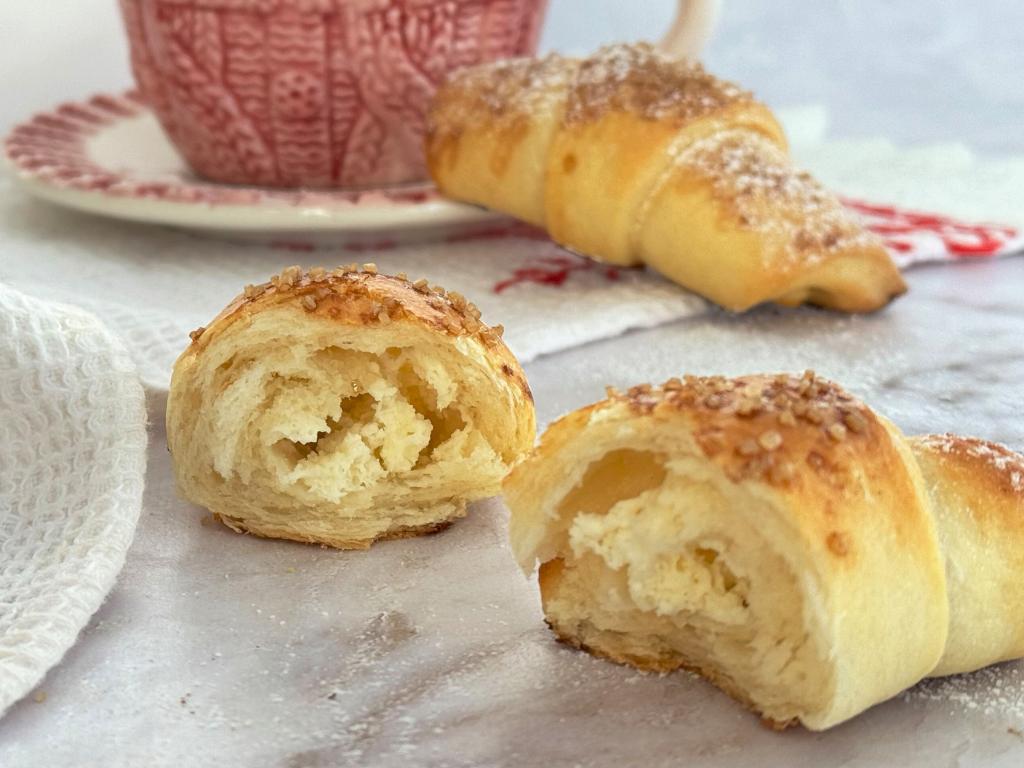 А вот как рогалик выглядит в разломе. Сочетание пушистого дрожжевого теста и нежной начинки из творога делает эту выпечку очень вкусной и аппетитной!