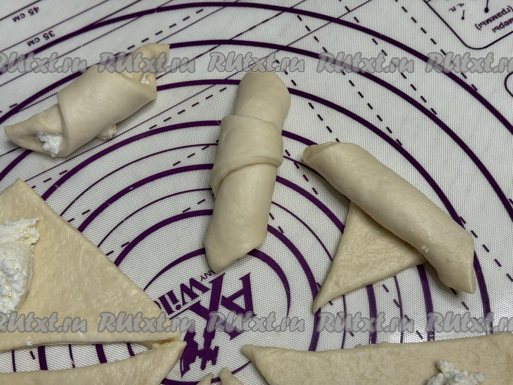 Начиная со стороны с творожной начинкой, свернуть треугольную заготовку из дрожжевого теста в рогалик.
