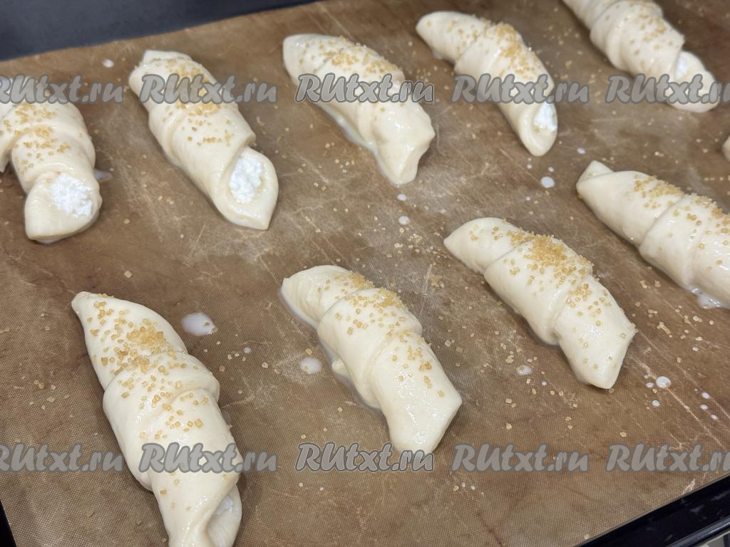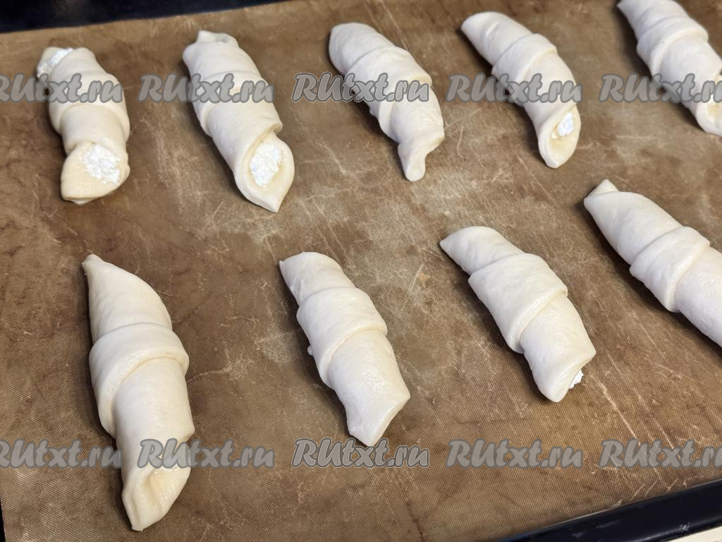 На противень, застеленный ковриком (или пергаментом) для выпечки, выложить заготовки дрожжевых рогаликов с творогом на расстоянии друг от друга.