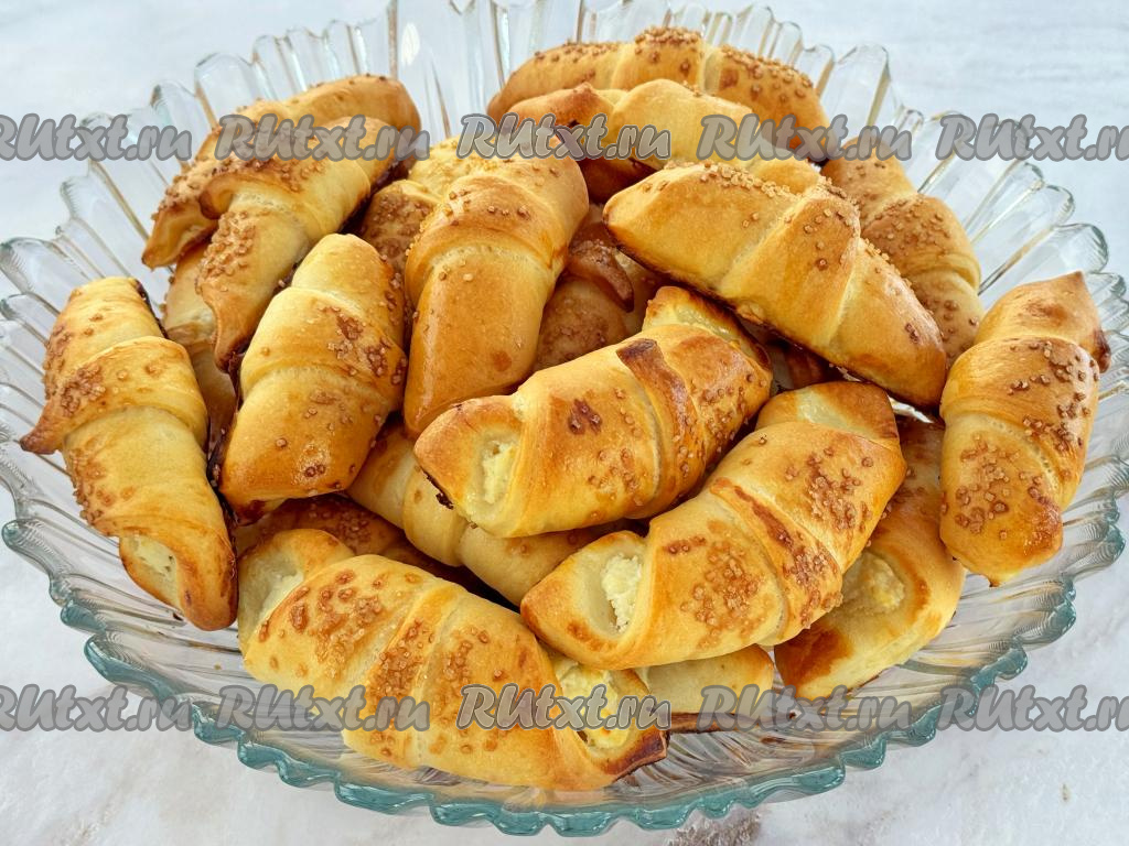 Готовые рогалики с творогом достать из духовки, переложить на тарелку. Постепенно испечь все рогалики из дрожжевого теста. Всего получается 24 рогалика.