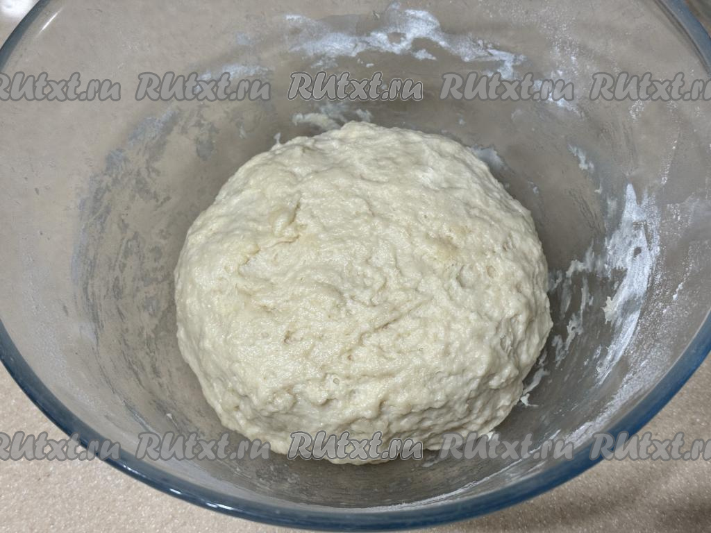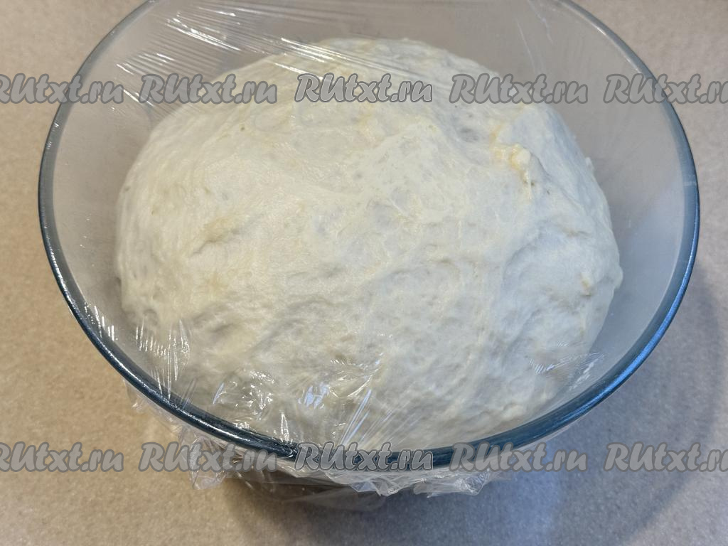 В общей сложности вымешивать тесто руками нужно не менее 7 минут. Частями добавляя муку и вмешивая её, замесить мягкое, пластичное тесто, которое практически не липнет к рукам. Муки может потребоваться как немного больше, так и немного меньше, чем указано в ингредиентах, главное - не забывать учитывать консистенцию замешиваемого теста. Миску с замешанным тестом накрыть пищевой плёнкой (или полотенцем) и поставить в тёплое место примерно на 1 час (до увеличения теста в объёме раза в 2-3).
