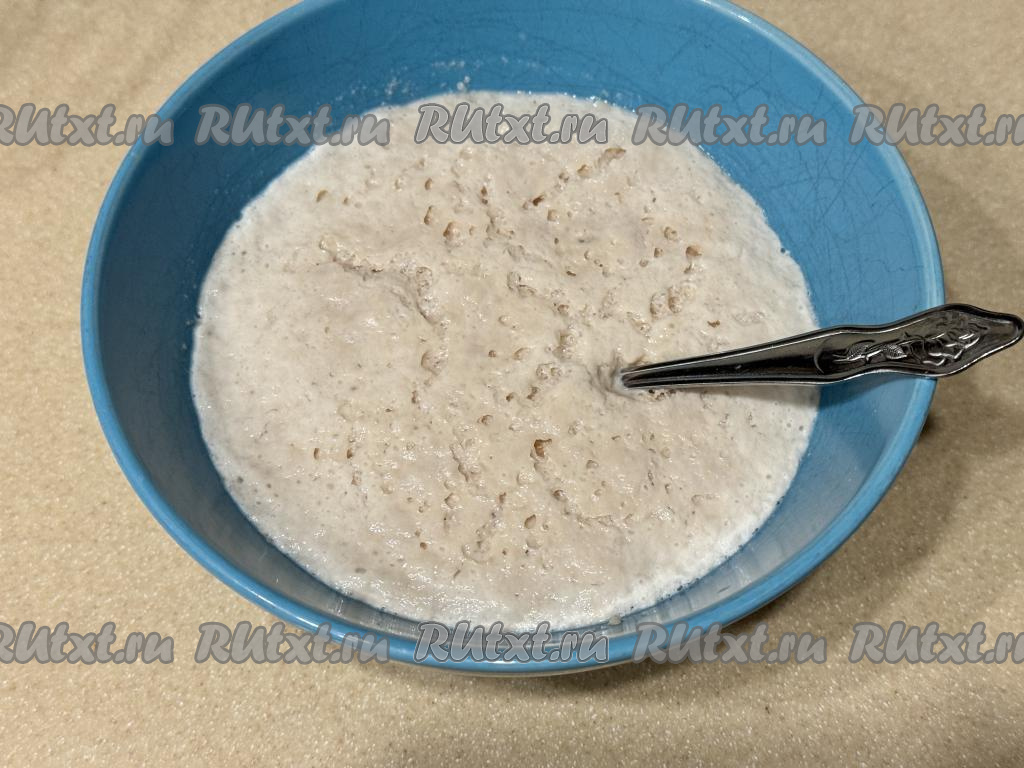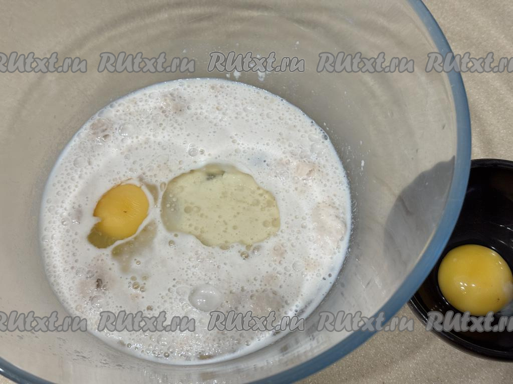После того как опара покроется шапочкой, перелить её в глубокую миску, добавить яйцо, соль и растительное масло, перемешать массу столовой ложкой до однородности.