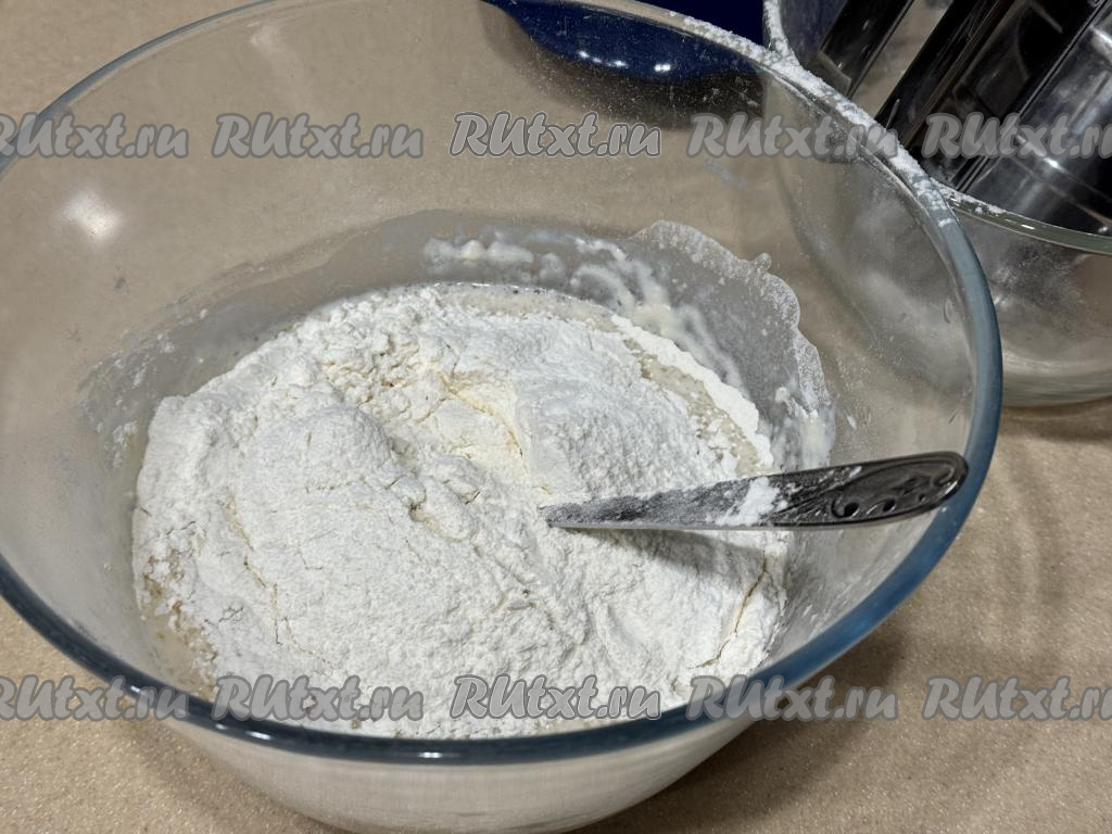 В миску с получившейся смесью всыпать 250 грамм муки, перемешать дрожжевое тесто для рогаликов столовой ложкой. Постепенно добавляя в миску оставшуюся просеянную муку и тщательно вмешивая её, вначале перемешивать тесто ложкой. А как только дрожжевое тесто начнёт собираться в ком, продолжать замешивать его руками, всыпая оставшуюся просеянную муку только по мере необходимости.