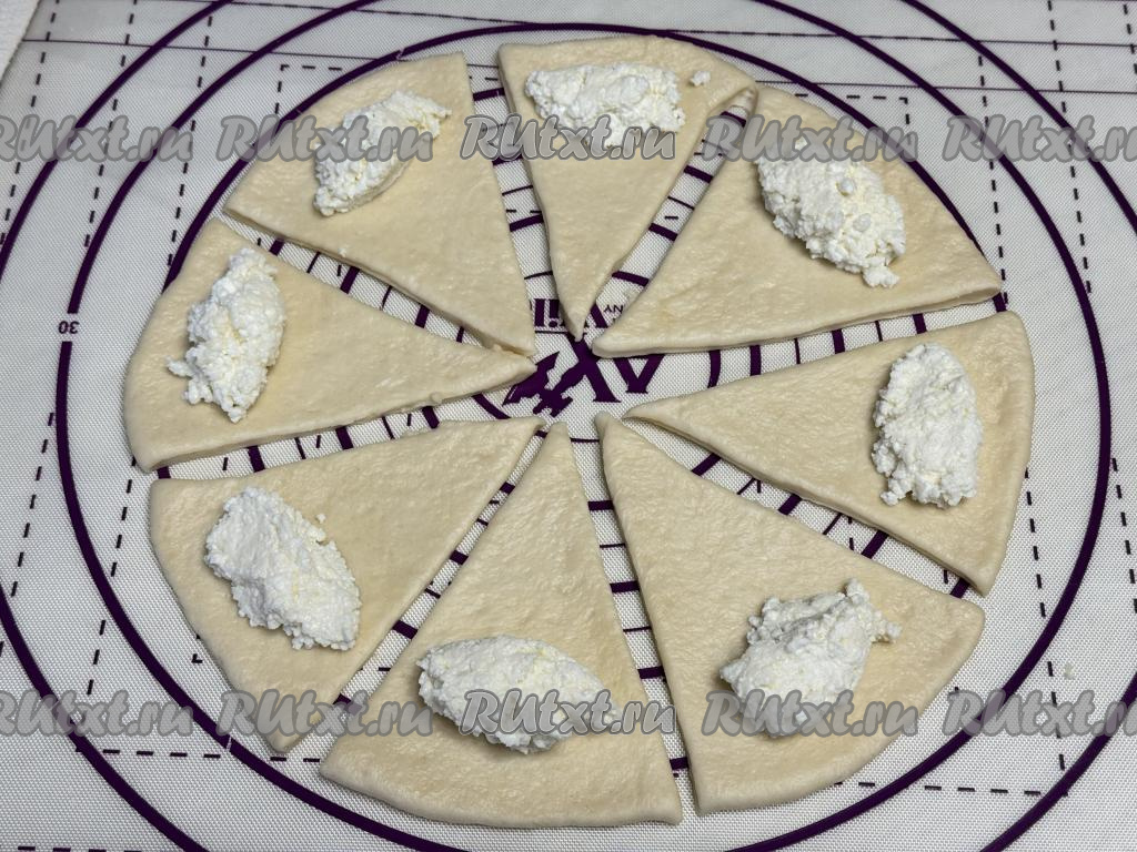Ближе к широкому краю каждой треугольной заготовки из теста выложить по 1 чайной ложке творожной начинки.