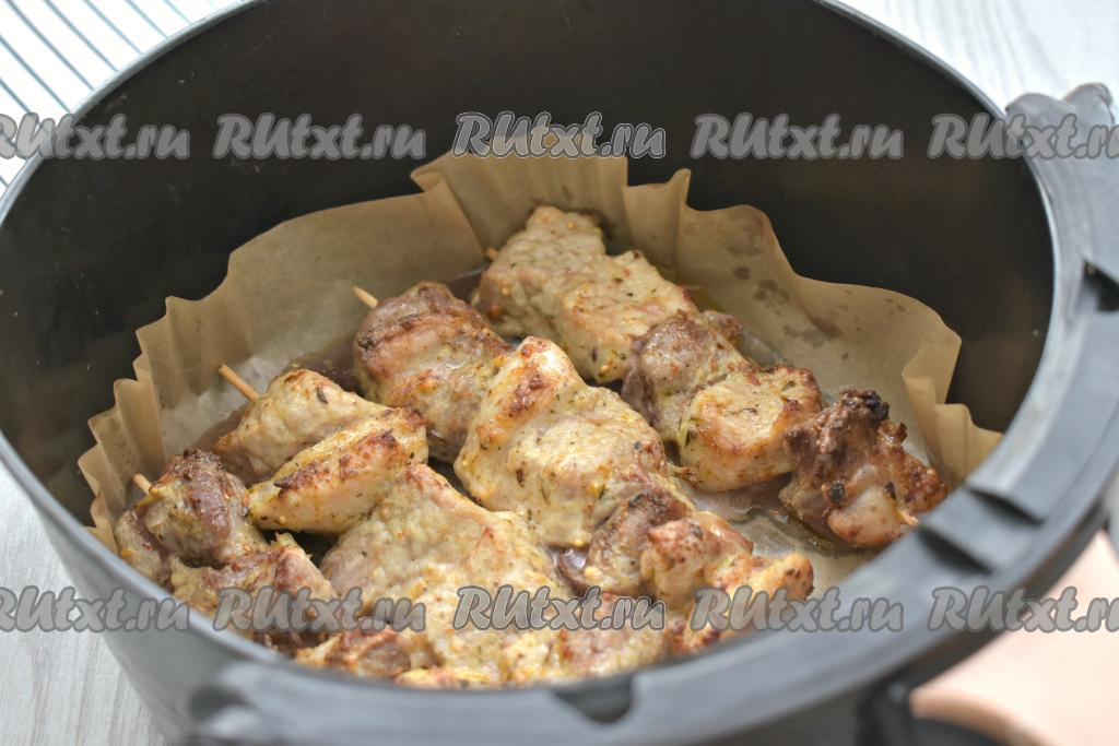 Отправляем чашу с шашлыками из свинины на шпажках в аэрогриль. Выставляем температуру 200 градусов, время - 35 минут. Через 15 минут с начала запекания достаём чашу из аэрогриля, шашлычки переворачиваем, снова отправляем в аэрогриль. Запекаем ещё 10 минут, снова переворачиваем и запекаем оставшееся время. Затем проверяем мясо на готовность, сделав на кусочке свинины надрез, если разрез светлый, без примесей крови, значит мясо готово. Если же в разрезе есть примеси крови, тогда увеличьте время запекания на 5-10 минут. У меня аэрогриль мощностью 1400 Ватт, я готовила шашлык из свинины 35 минут.