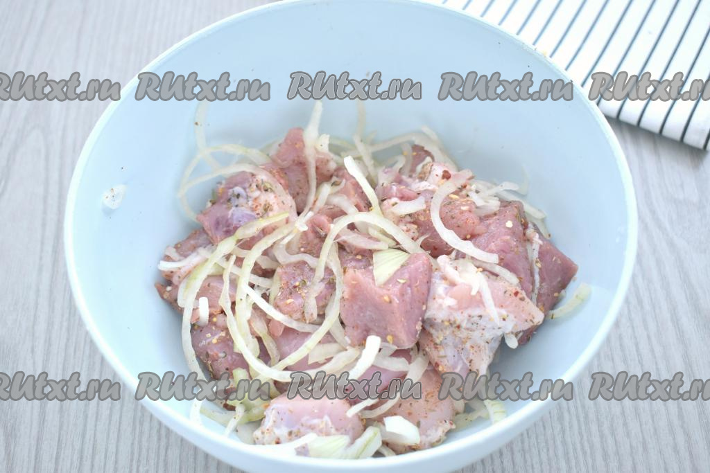 Тщательно перемешиваем кусочки свинины с луком и специями, стараясь мять руками и мясо, и лук. В процессе маринования луковый сок хорошо размягчает мясо, поэтому шашлык будет более нежным и сочным.