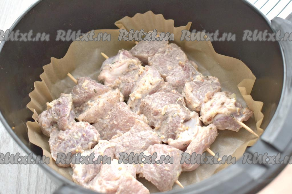 За 15 минут до начала приготовления шашлыков в аэрогриле деревянные шпажки выкладываем в достаточно глубокую посуду, заливаем полностью холодной водой. Благодаря замачиванию, шпажки не будут тлеть в процессе приготовления шашлыков. Затем кусочки свинины, замаринованные в майонезе, нанизываем на подготовленные шпажки и выкладываем в чашу аэрогриля, заранее застеленную пергаментом. Лук нам больше не понадобится. У меня получились 4 шашлычка.