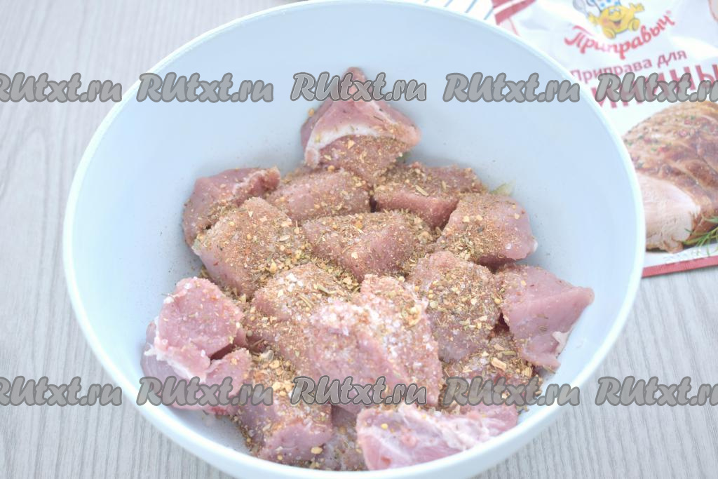 По вкусу солим кусочки свинины (добавляя соль, обязательно учитывайте, что в дальнейшем мясо будет мариноваться в майонезе, а он достаточно солёный), всыпаем специи (в качестве специй я использовала 1 чайную ложку приправы для свинины).