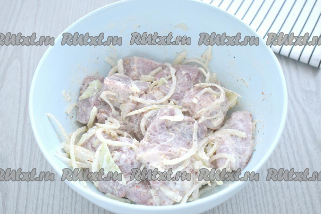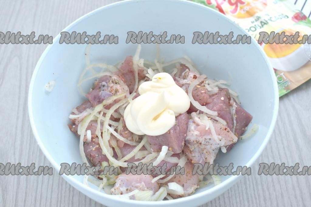 Миску с кусочками свинины и луком затягиваем пищевой плёнкой (или накрываем крышкой), убираем в холодильник часа на 2 (можно и на более длительное время), чтобы мясо хорошо промариновалось в майонезе и луке.