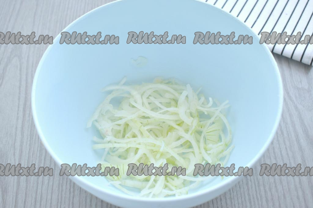 Лук очищаем, нарезаем тонкими полукольцами, выкладываем в глубокую миску. Мнём лук руками, чтобы он выделил немного сока.