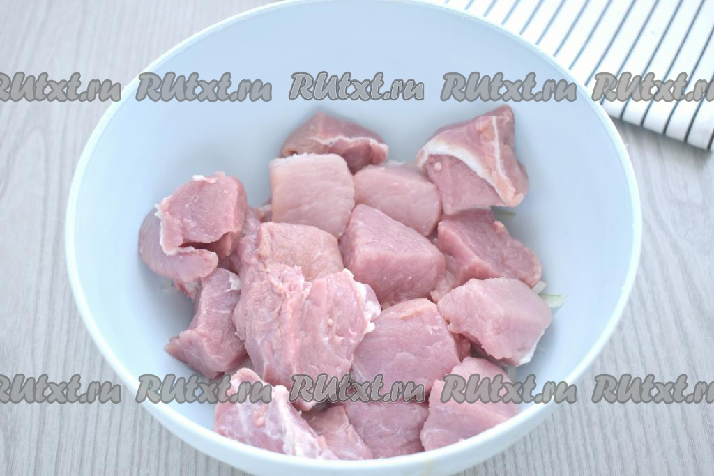 Мякоть свинины моем, обсушиваем, нарезаем на кубики с размером стороны примерно 3-3,5 сантиметра, выкладываем в миску с луком.