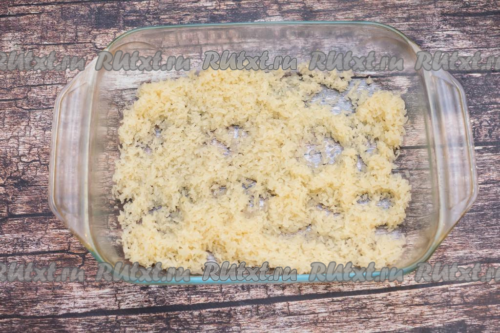 В форму для запекания выложить промытый рис ровным слоем.
