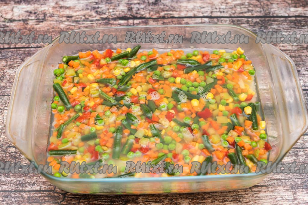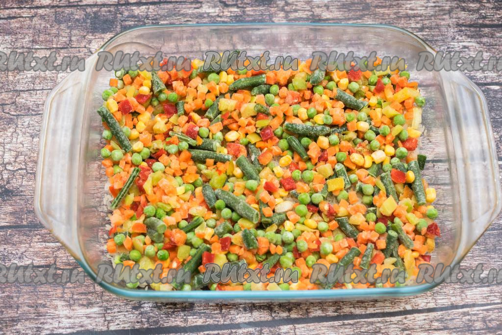 Мексиканскую смесь, не размораживая, выложить поверх риса, равномерно распределив по всей форме.