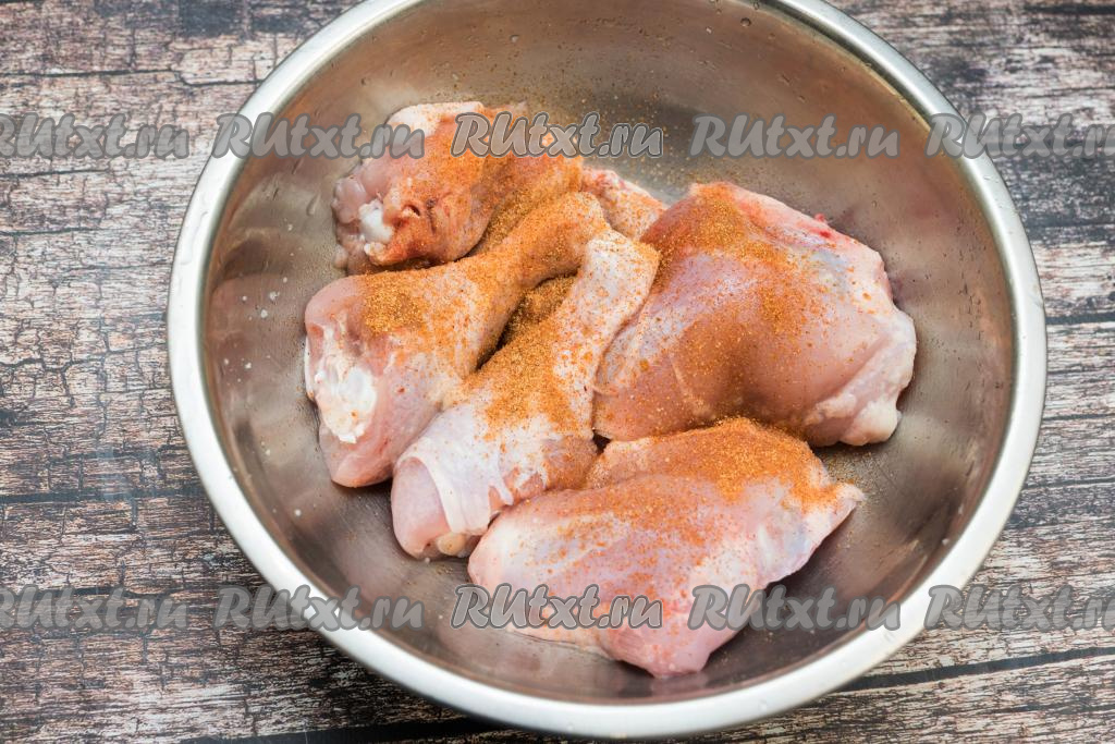 Части курицы посолить, посыпать любимыми специями для мяса. Тщательно перемешать, покрывая кусочки курицы специями со всех сторон.