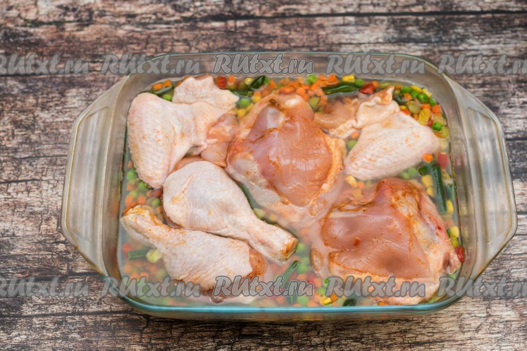 Поверх овощей разместить кусочки курицы и отправить форму в разогретую до 180 градусов духовку.