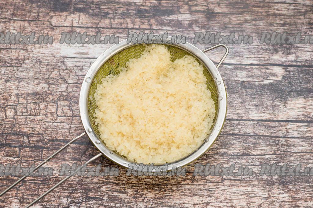 Рис отмерить, выложить в сито, хорошо промыть под проточной холодной водой, дать стечь лишней воде.