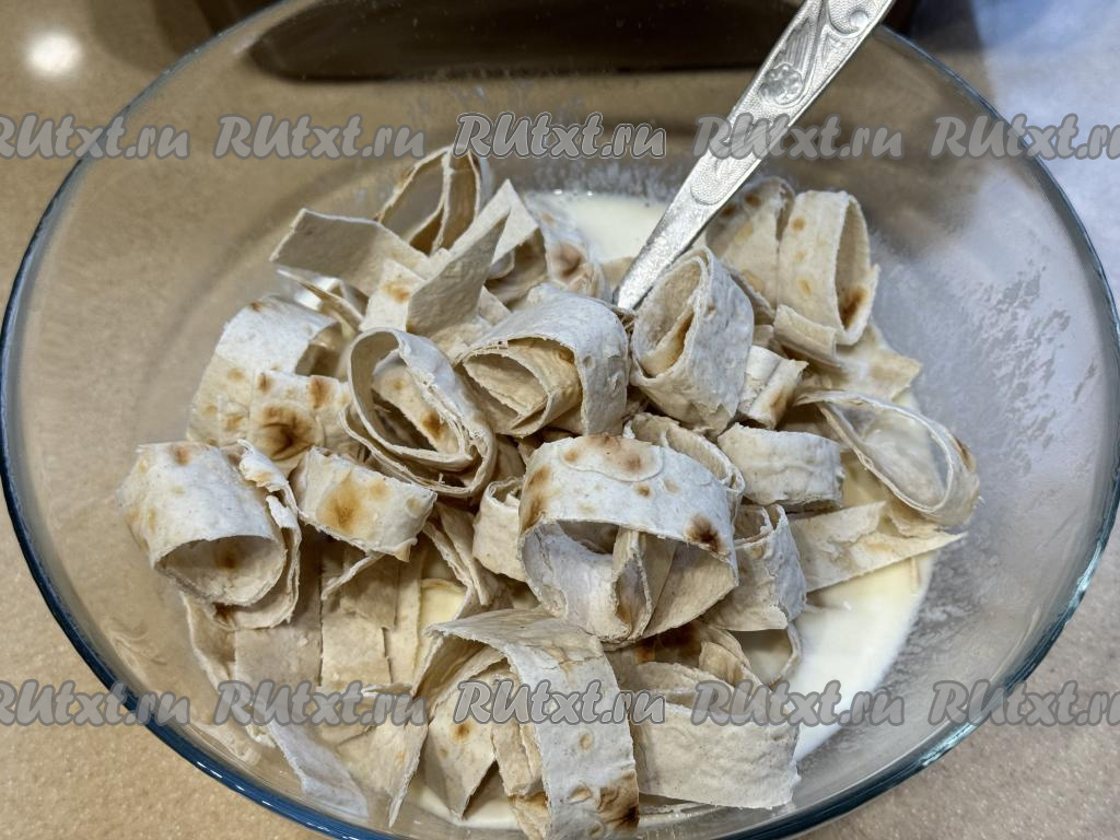 Остальной лаваш нарезать на полоски шириной примерно 1,5 сантиметра. Выложить нарезанный лаваш в миску с яично-молочной смесью.